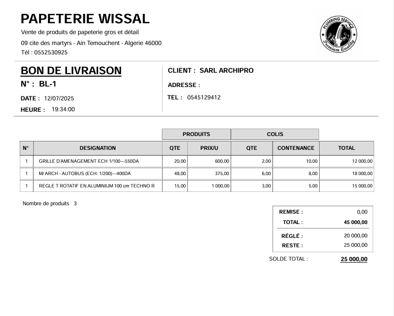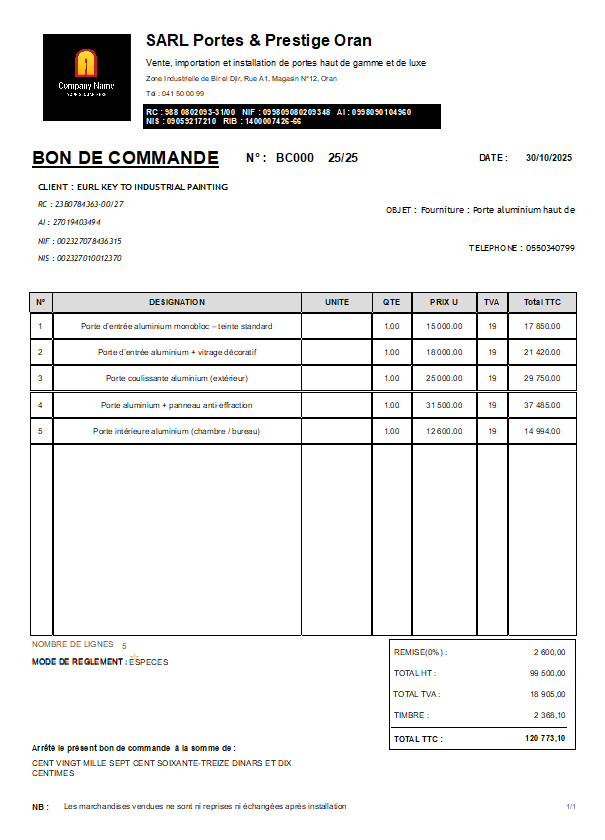 📄 Factures – Proformas – Bons de livraison – Bons de commande – Entrées/Sorties stock – Ordres de fabrication – Listes de clients – Listes de fournisseurs – Listes de produits – Versements – Situations – Étiquettes codes-barres