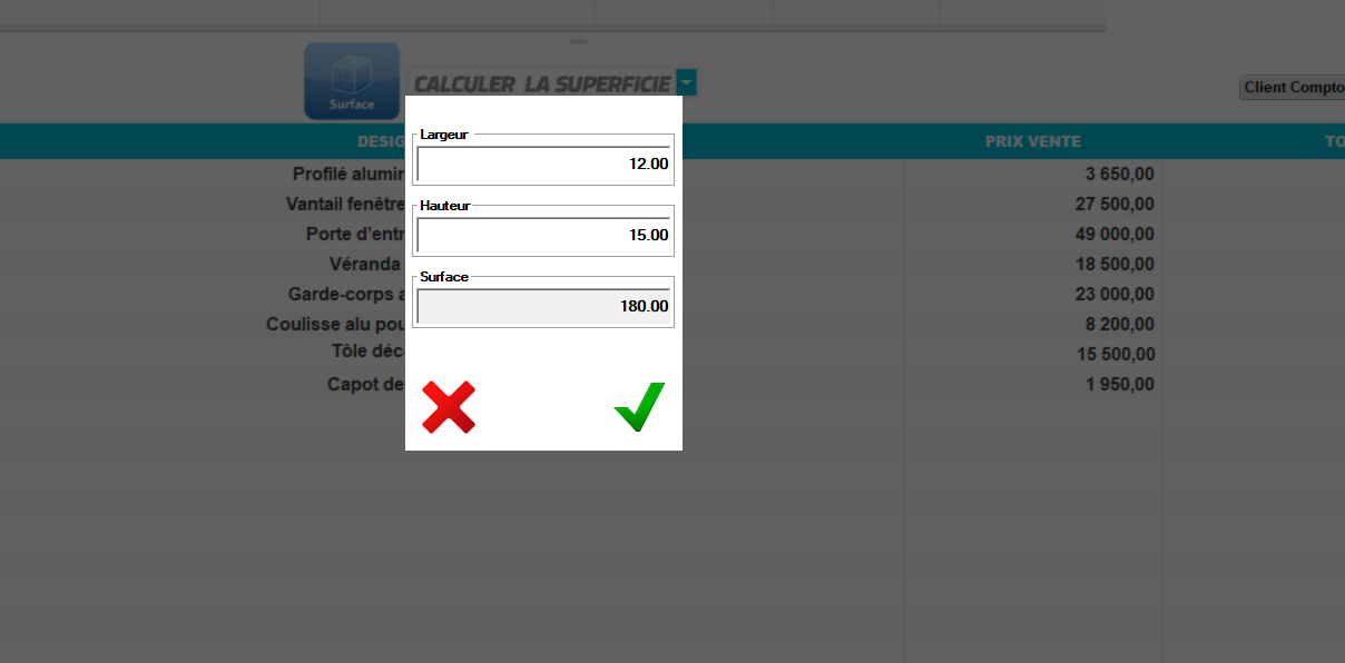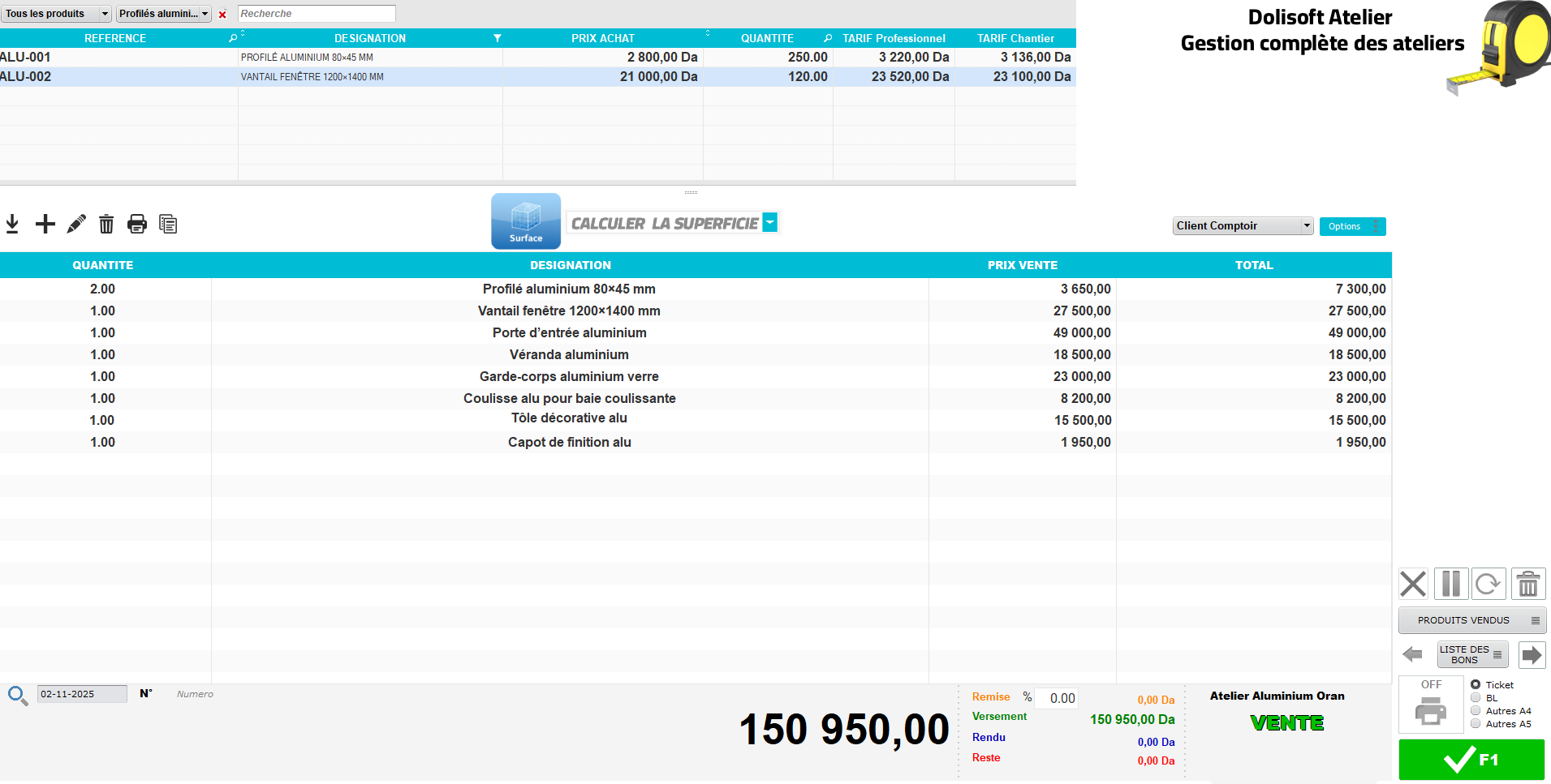 أقوى ميزة في دوليسوفت هي خاصية الحساب التلقائي للمساحة. يكفي إدخال الطول(Longueur) والعرض(Largeur) لأي منتج مثل باب، نافذة، خزانة أو ستار، وسيحسب البرنامج مباشرة المساحة(Surface)، ويطبق السعر بالمتر المربع(M2) ويعطيك المبلغ الإجمالي في ثواني فقط، سواء في عرض سعر(Devis)، أمر شراء(Commande)، سند تسليم(Bon de livraison) أو عملية بيع مباشرة(Vente au comptoir).